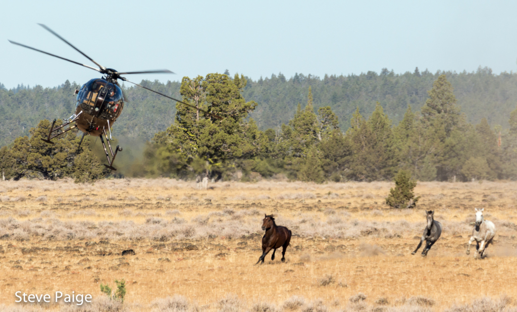 A contractor’s helicopter pursues wild horses at the Devils Garden Wild Horse Territory in California in 2016. RTF file photo by Steve Paige.